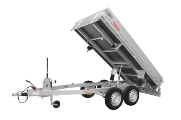 Basic Rückwärts-Kipper, serienmäßig ausgestattet mit 30 cm hohen Alubordwänden, gut gestütztem Holzboden und Stützrad. Der ANSSEMS Anhänger verfügt über eine Handpumpe, einen 2-stufigen, hartverchromten Kippzylinder und hat einen Kippwinkel von bis zu 49 Grad.
