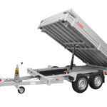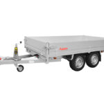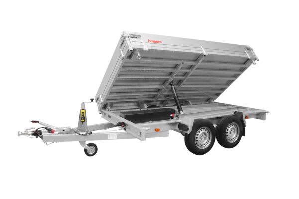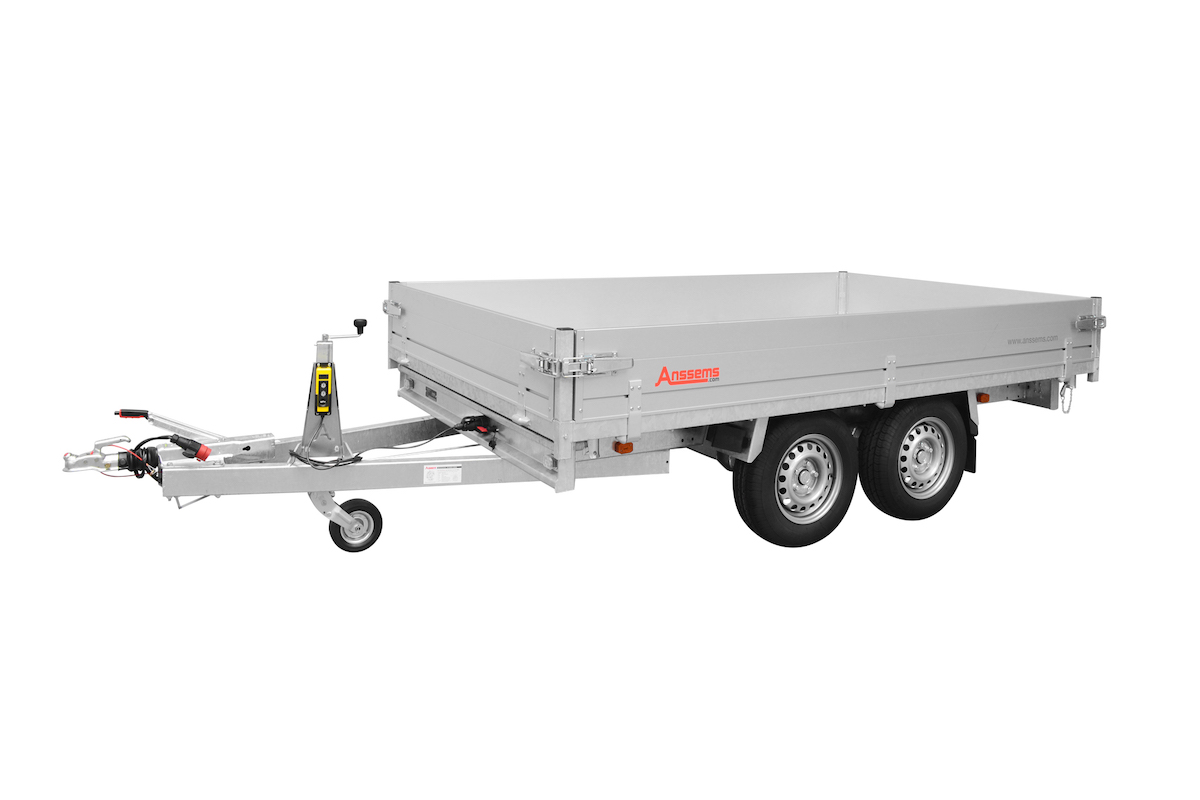 Dreiseitenkipper mit stabilem, verschweißten Rahmen. Serienmäßig ausgestattet mit 30 cm hohen Alubordwänden, gut gestütztem Stahlboden, 4 Bindehaken im Kasten, Seitenbeleuchtung und Automatikstützrad. Zum einfachen Kippen verfügt der ANSSEMS Anhänger über eine elektrische Pumpe, Hauptstromschalter, Kabelfernbedienung, 4-stufigem hartverchromtem Kippzylinder, einem Warnsignal beim Herablassen des Kippkastens und einem separat mitgelieferten Akkulader. Pumpe und Akku sind mit einer Kappe abgedeckt. Serienmäßig sind auch Rampenhalter unter der Ladefläche integriert.