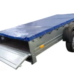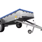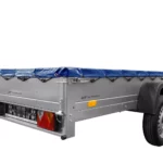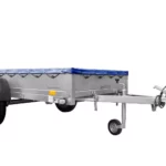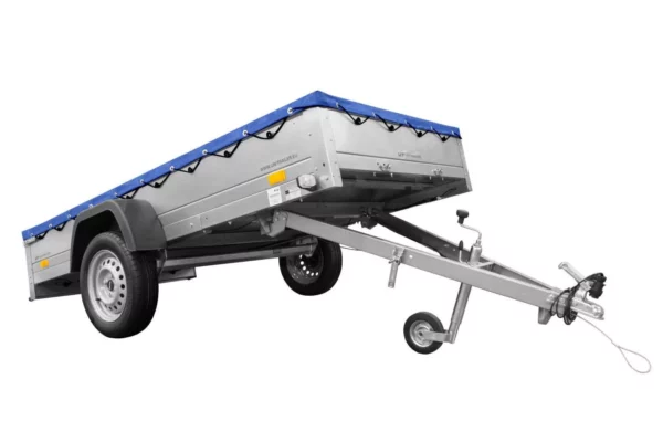 Einachs-Tieflader GARDEN TRAILER 264 KIPP von Unitrailer mit Stützrad, Querstreben und blauer Flachplane