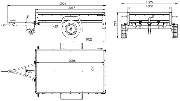 • KÖRPER – Boden aus hochwertigem, wasserfestem und rutschfestem Sperrholz. 9 mm mit Transportflächenmaßen: 2006 mm lang x 1256 mm breit. Gesamtabmessungen des Anhängers: 2906 mm lang x 1685 mm breit x 777 mm hoch.