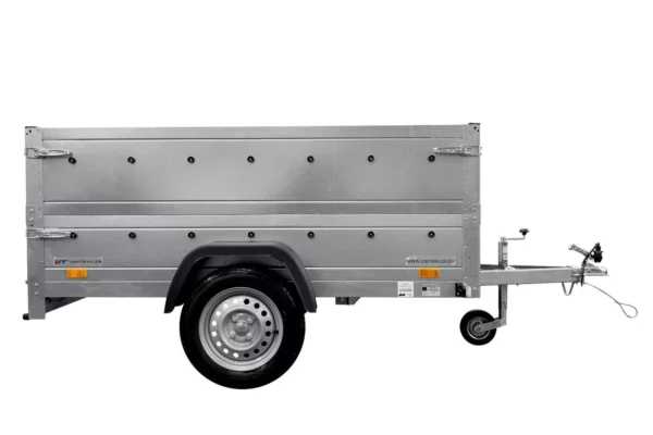– Sonderbestellung auf Anfrage Unitrailer. Radgröße: 155/70 R13. Kippbare V-Deichsel, die jederzeit unter der Bodenplatte des Anhängers eingeklappt werden kann. - AUFBAU – Tragrahmen aus feuerverzinktem Stahlblech. Es wurden gebogene Profile mit Schrauben verwendet. Ladefläche: rutschhemmende und wasserverleimte Siebdruckbodenplatte, 9 mm dick.